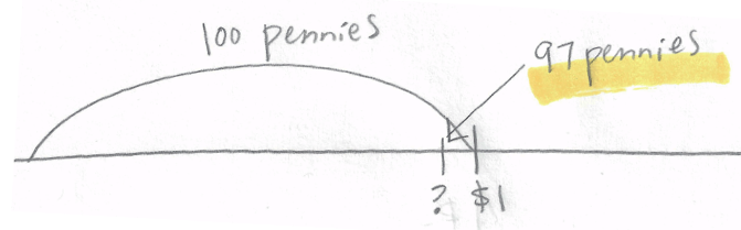 Well, it turns out I don’t have 97 dimes but I sure have a lot of pennies at home. If I made a crazy tower of 97 pennies, how much would that be? What are you picturing now? How could I represent that?