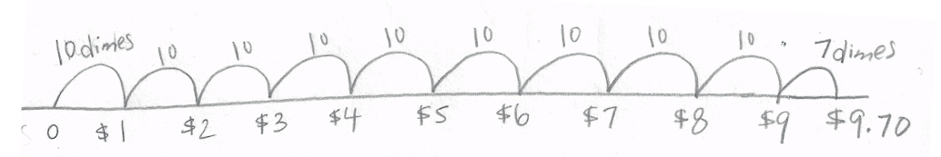 Kids might say: I knew every 10 dimes was a dollar, so I made groups of ten dimes. 90 dimes would be….. nine dollars, plus seven leftover dimes which would be 70 cents, so $9.70.