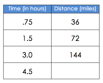 [Expect that at least a few students will double the 144 because they will overgeneralize the pattern of doubling. That’s great if it happens because it gets kids really defending their thinking. When it happened with Erica’s class I just recorded the possible distances (288 miles, 216 miles), noted that we did not agree and then let kids describe how they got their answers. It is so often the case that simply by talking through their thinking, a student will revise their ideas, “No, no, wait! I change my answer. I actually agree with Marissa now. I was doubling, but the 3.0 doesn’t double to make 4.5.”]