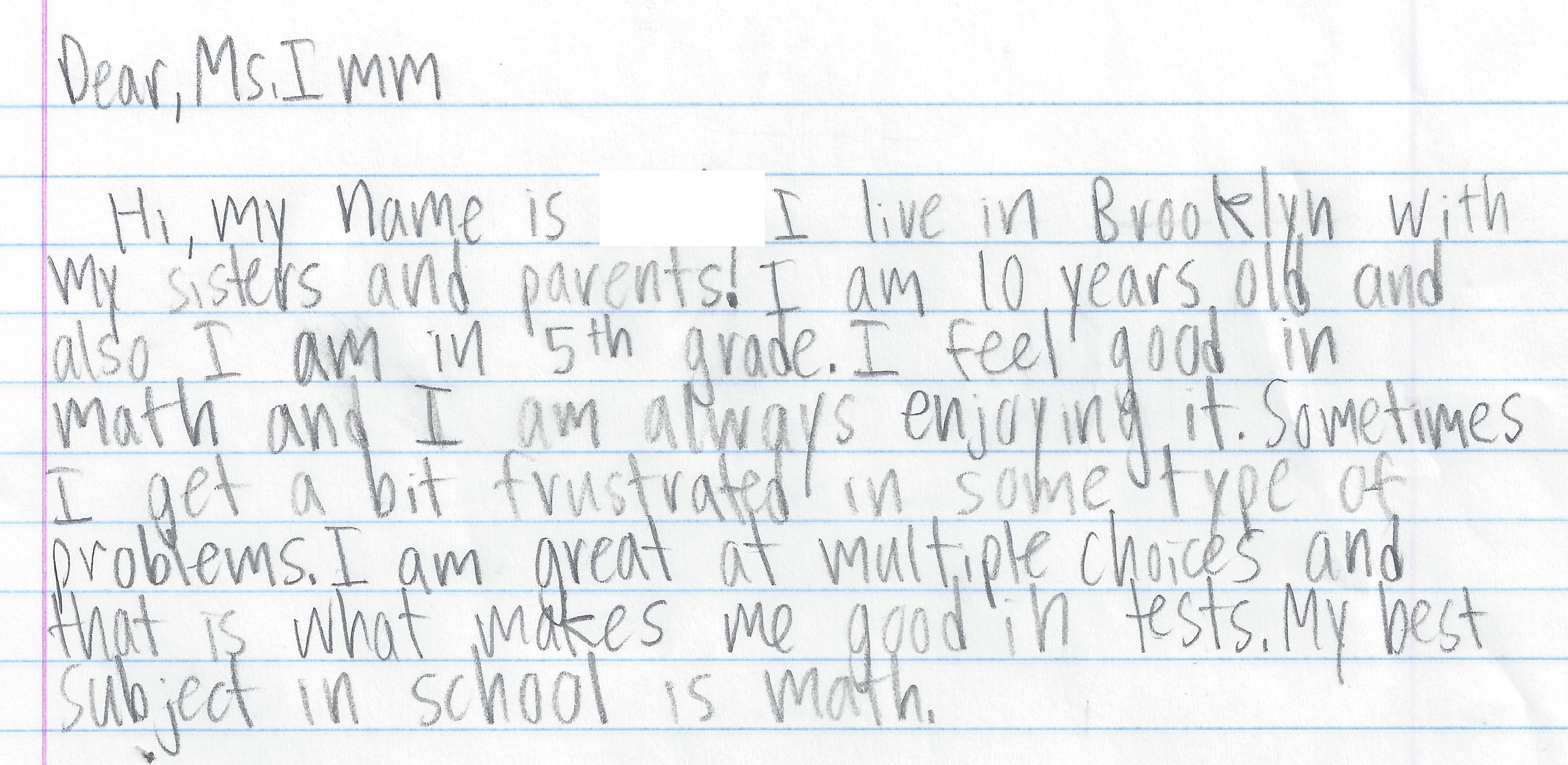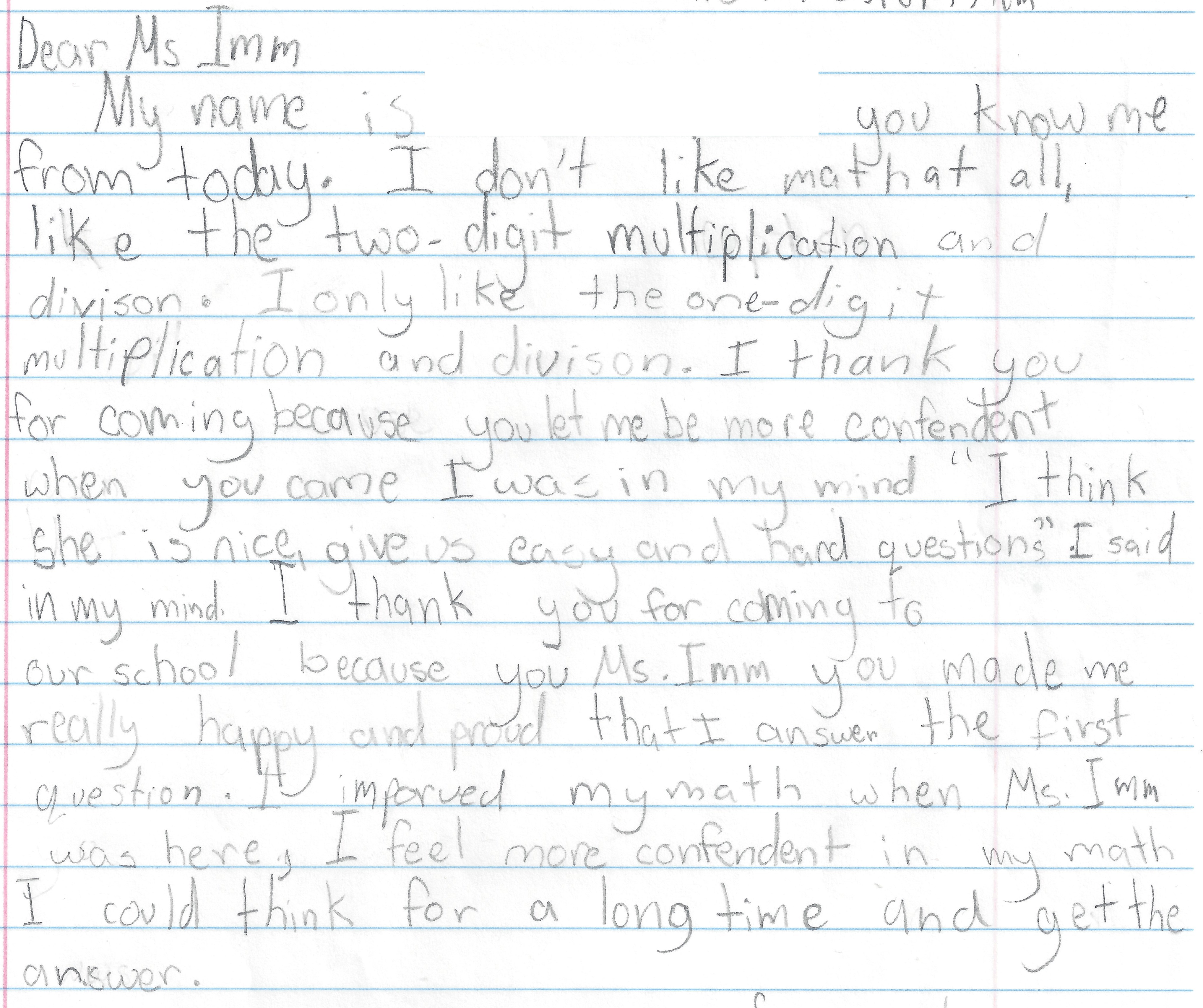 A few days later Rachel presented me with a beautiful stack of letters. “That’s what we always do when a visitor comes,” she explained, matter-of-factly. I read each letter carefully, looking for evidence of how Rachel’s students were thinking about, and relating to, mathematics. Here are a few poignant examples….