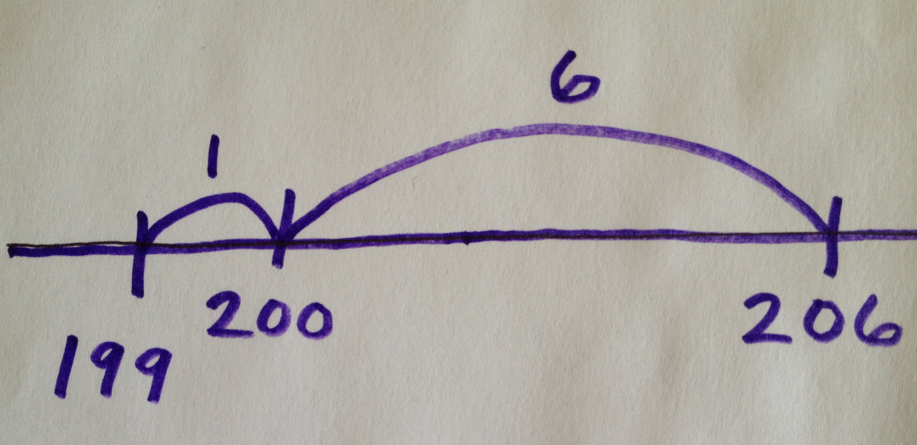 2) Then I used the open number line as a way to represent their thinking during number strings. So, if a learner told me that she solved 206 – 199 by starting from 199 and adding up to 200, then 206, I might model the problem like so: